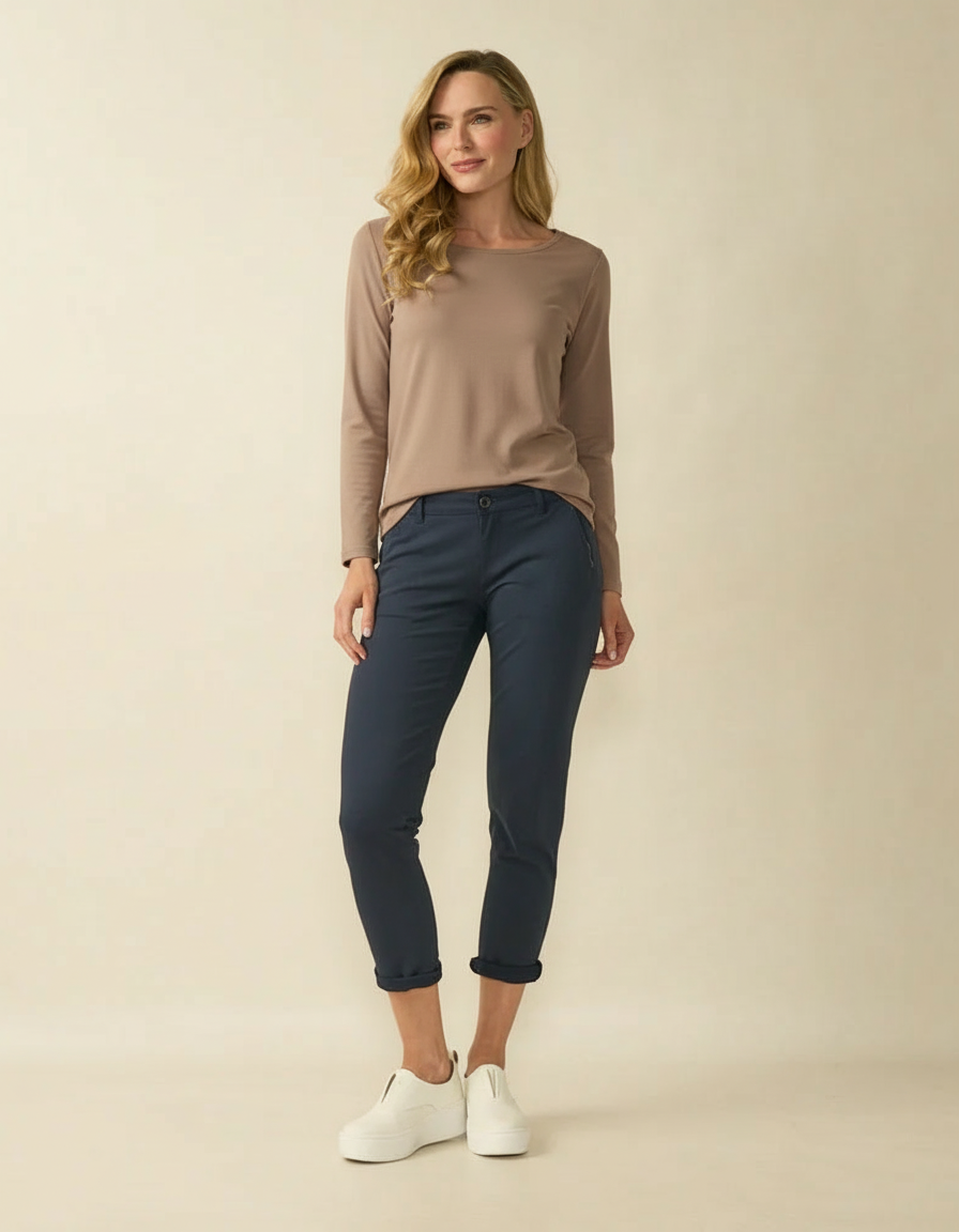 Le top basique taupe PAULA présente une encolure ronde classique et des manches longues. Conçu comme un basique polyvalent, il s'intègre facilement à toutes les garde-robes et se porte aussi bien seul qu'en superposition, pour un style affirmé et décontracté.