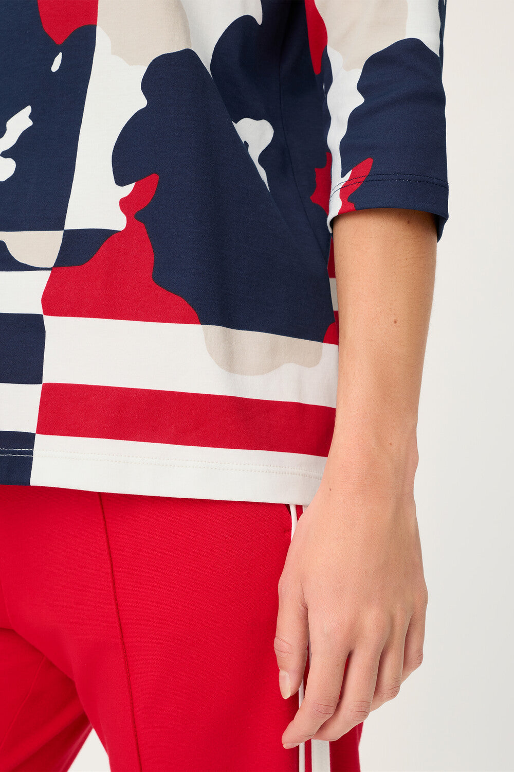 Ce top Olsen est une pièce remarquable, orné d'un imprimé Panneaux raffiné. Sa coupe droite « Hannah » lui confère une allure ample et flatteuse. L'encolure ronde classique et les manches 3/4 apportent une touche de légèreté féminine, tandis que l'ourlet droit souligne les lignes nettes. Confectionné en interlock doux 100 % coton, ce top offre un confort optimal et un toucher agréablement lisse. Longueur : environ 62 cm.