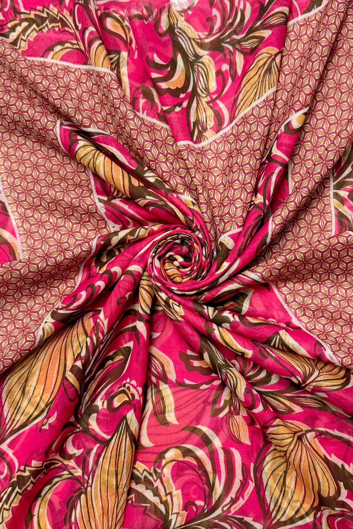 Écharpe effilochée à motif de feuilles rose fuchsia d'inspiration indienne. Dimensions : 90 cm x 180 cm